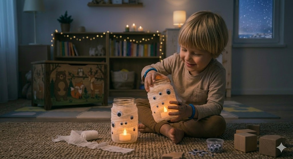 Valolla on suuri merkitys halloween-tunnelman luomisessa. Itsetehdyt lyhdyt, jotka siivilöivät valoa pelottavien kuvioiden läpi, luovat jännittäviä varjoja huoneen seinille. Lapsille turvallisinta on käyttää led-tuikkuja tai valoketjuja perinteisten kynttilöiden sijaan. Lasipurkkien koristelu kuvioteipillä tai silkkipaperilla on helppo tapa valmistaa tunnelmallisia valaisimia, jotka sopivat niin sisälle kuin katetulle terassillekin. Valaistusprojektit opettavat lapselle, kuinka valo ja varjo toimivat yhdessä luoden erilaisia efektejä.